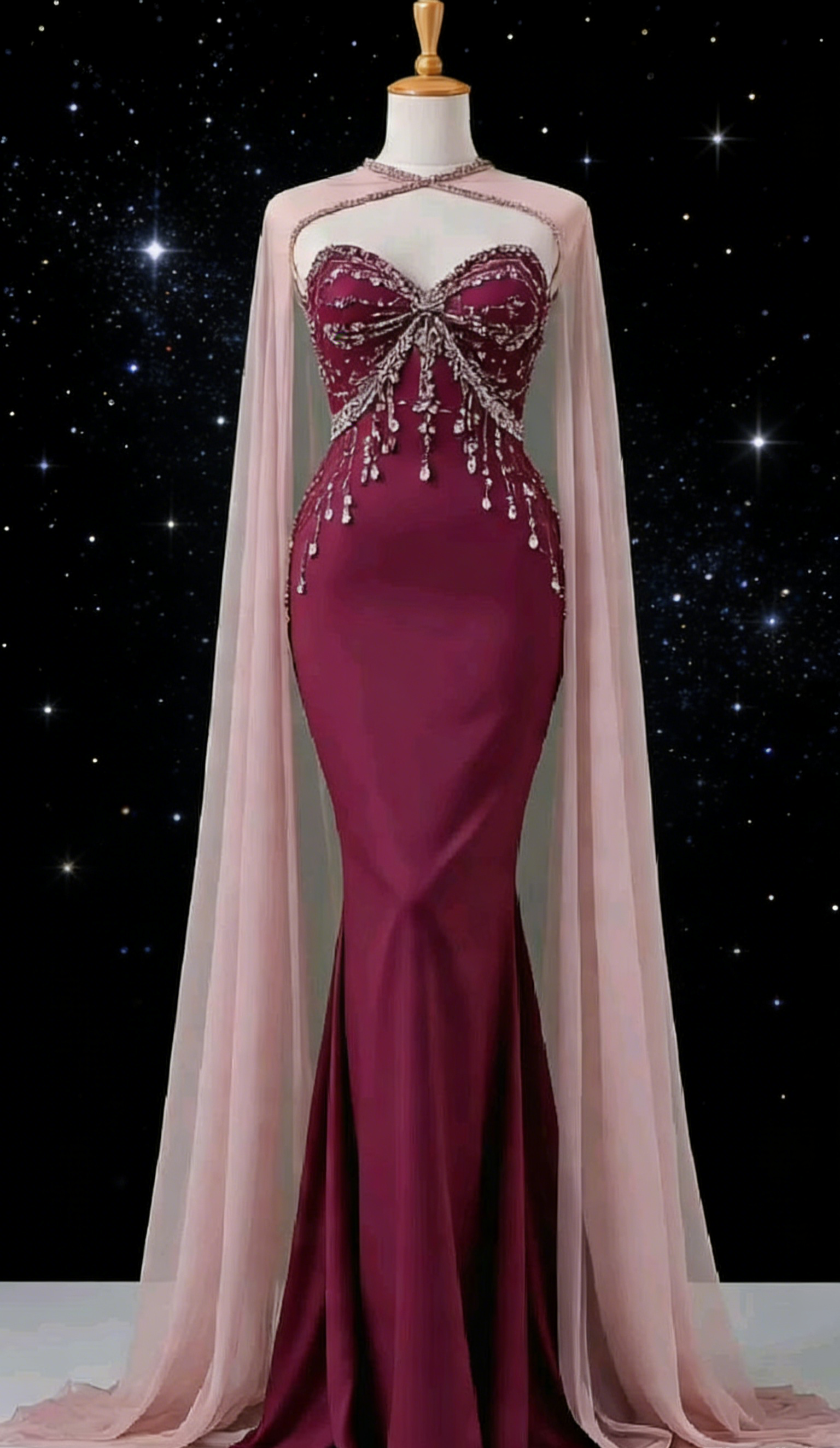 Burgundy Strapless Beaded Gown - Bow Cape Mermaid Evening/Red Carpet/Theme Party Maxi Dress NV6820