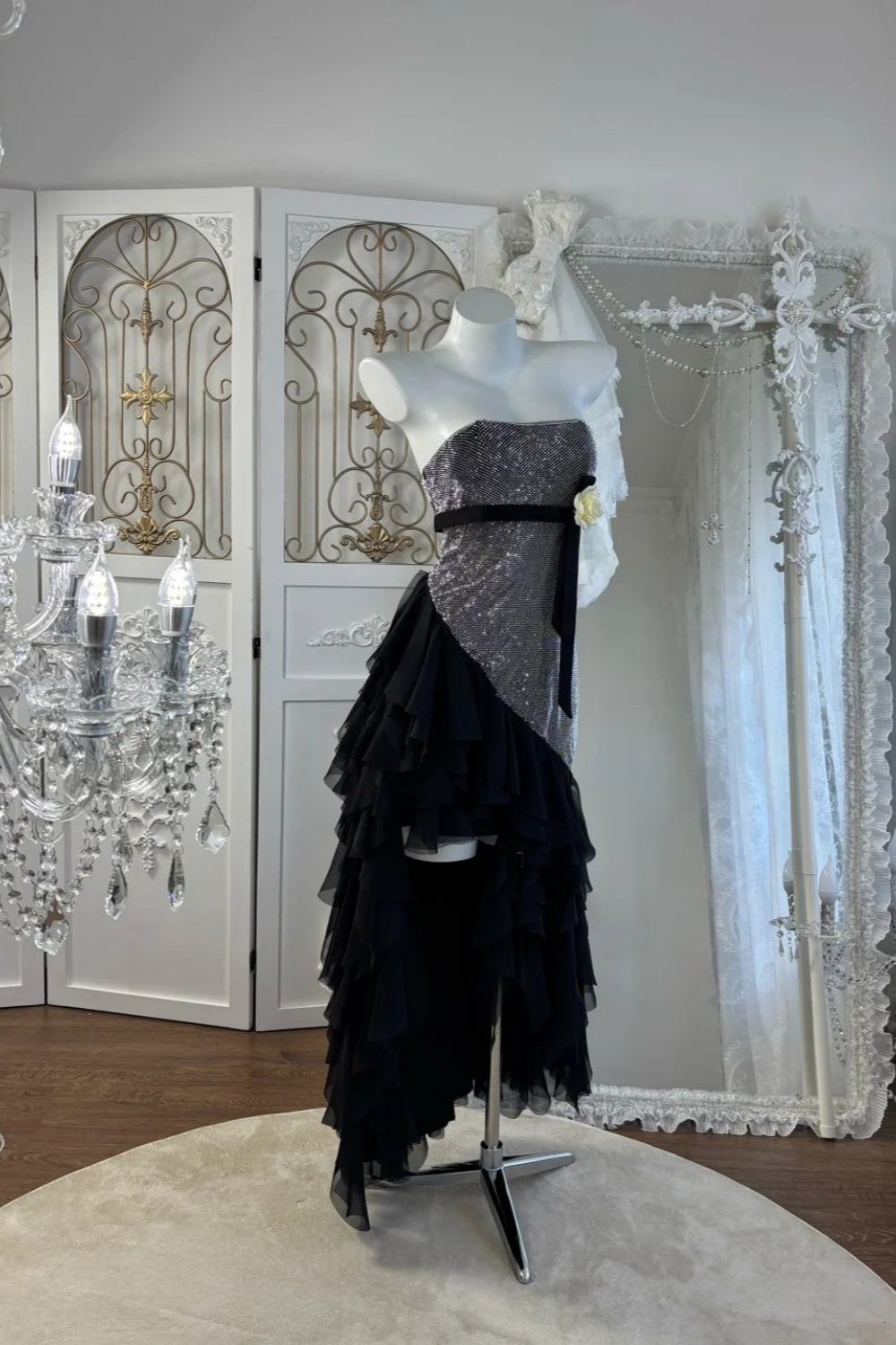 Trending Now Black-Silver Sequin Dress: Asymmetric Tulle Hem & Halter Option NV6839