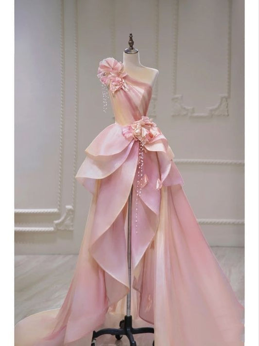 Robe de soirée longue en satin et tulle rose, élégante et exquise, à fleurs perlées, épaules dénudées, longueur au sol, à paillettes, nv3821