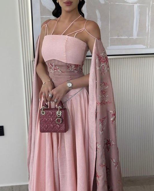 Robe de soirée longue en tulle à bretelles florales exquises et vintage rose nv3311