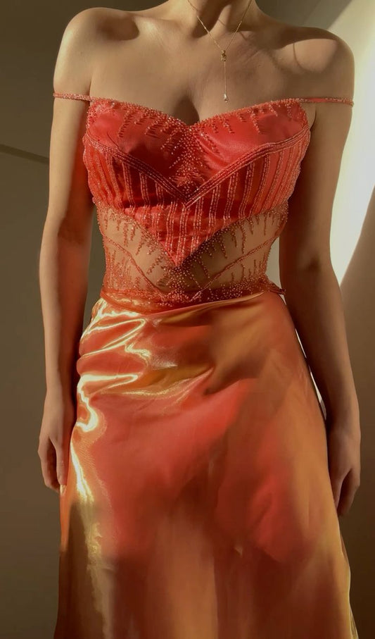 Robe de soirée longue en tulle à bretelles spaghetti et perles Orange Fashion exquise nv3318