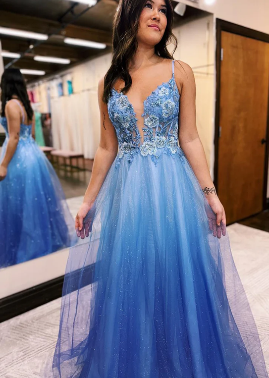 Robe de soirée longue et sexy à bretelles spaghetti en ligne A bleue nv1002