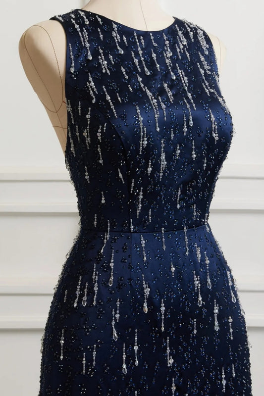Robe de soirée de cérémonie luxueuse bleu marine ornée de perles NiceVestidos NV6094