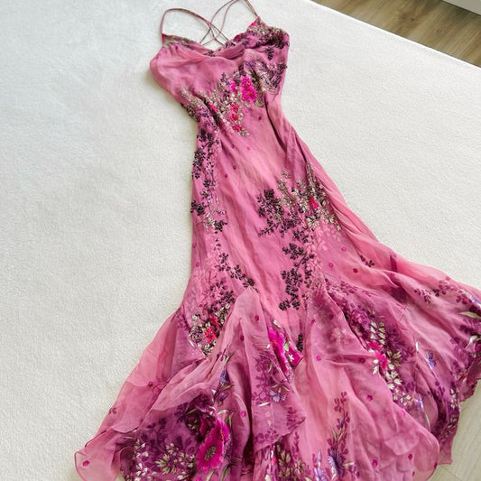 Robe longue rose à bretelles spaghetti et volants, robe de soirée longue, nv2695