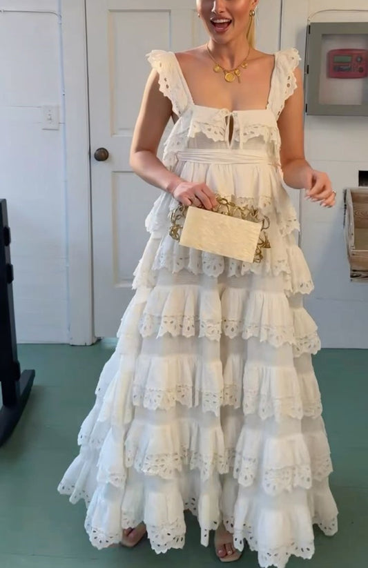 Robe de soirée longue en tulle à volants en dentelle blanche exquise et élégante nv3362