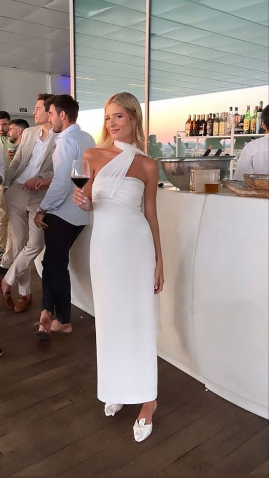 Robe de soirée longue blanche simple et élégante à bretelles spaghetti serrées nv2011
