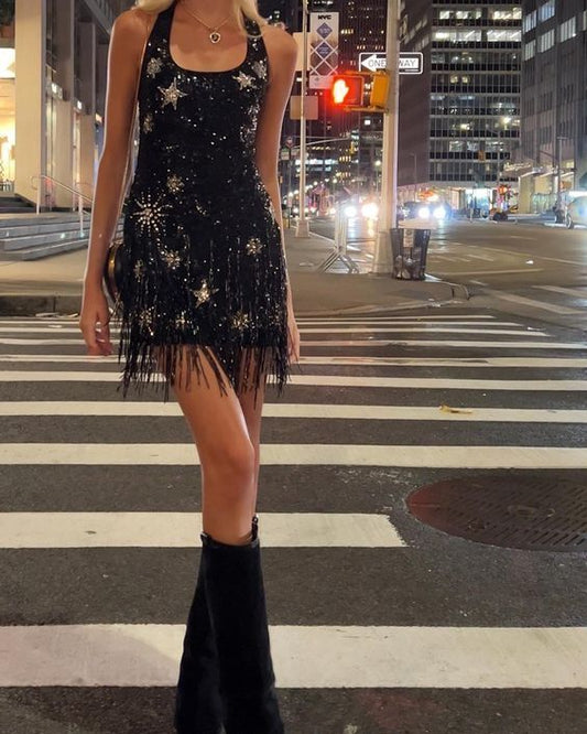 Robe de soirée courte et impressionnante à paillettes noires brillantes et sexy pour impressionner nv2584