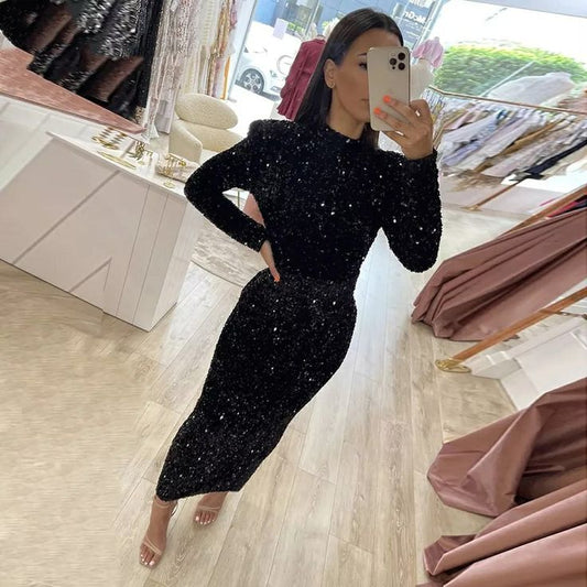 Robe de soirée noire à paillettes brillantes et manches longues nv3193