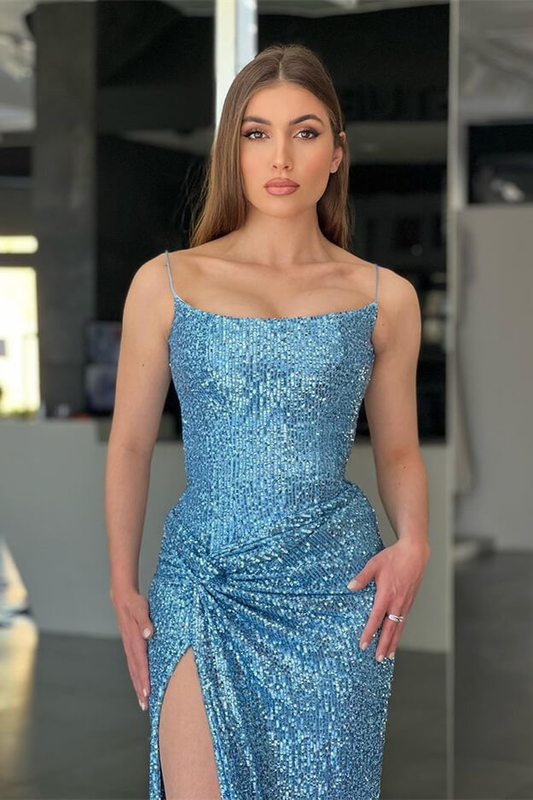 Robe de bal longue bleue à bretelles spaghetti et paillettes avec fentenv757