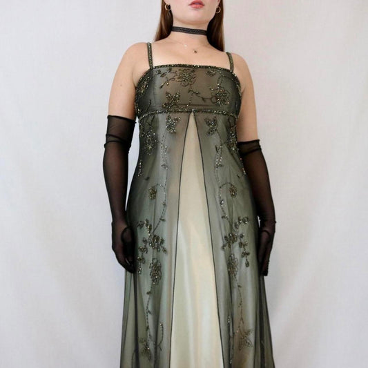 ✨ Robe Empire Vintage Vert et Or Floral Paillettes Ombre Perlée Taille Haute Longue Tulle Robe de Bal Formelle Robe de Soirée Robe de Soirée nv4982