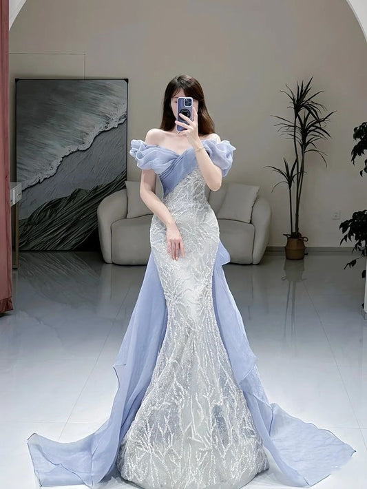 Robe de soirée longue en tulle bleu brillant à paillettes et perles, style sirène, élégante et fine, nv3251