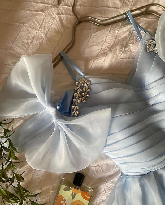 Robe de soirée élégante à manches courtes en tulle bleu doux et ornée de strass NV3002