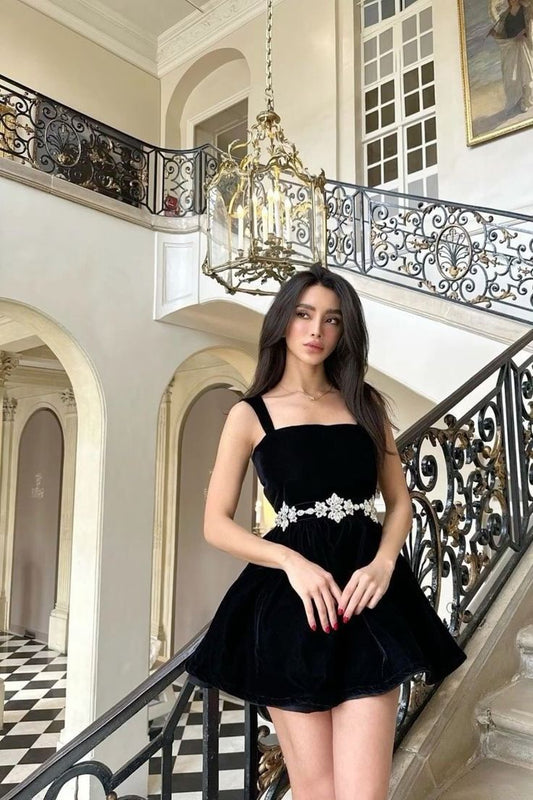 Robe de soirée courte en velours noir sans bretelles avec appliques nv2996