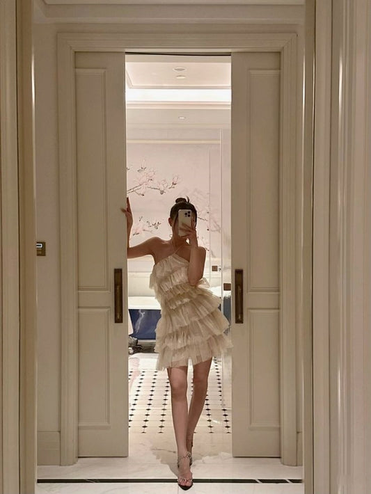 Robe de soirée courte en mousseline de soie jaune douce et mignonne, ligne A, une épaule, robe d'anniversaire, robe de soirée nv2968