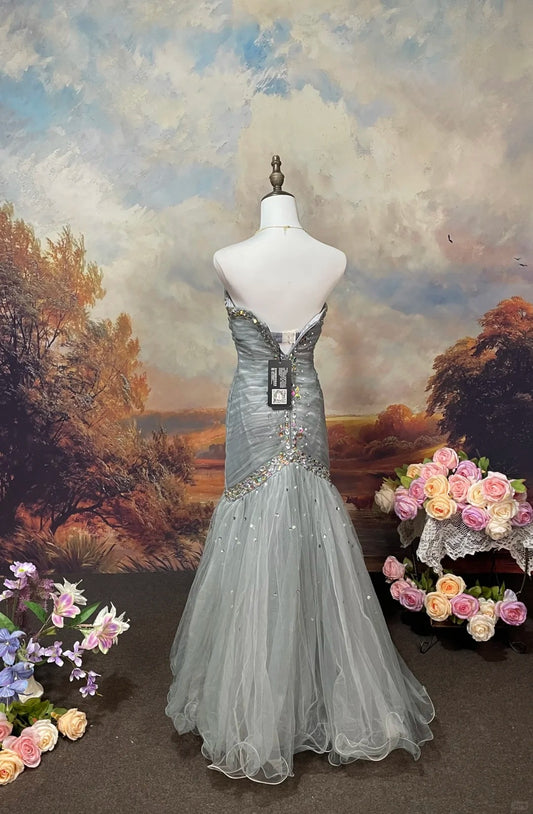 Robe de soirée longue en tulle gris argenté, élégante et vintage, ornée de pierres précieuses et de perles, robe de bal nv4079