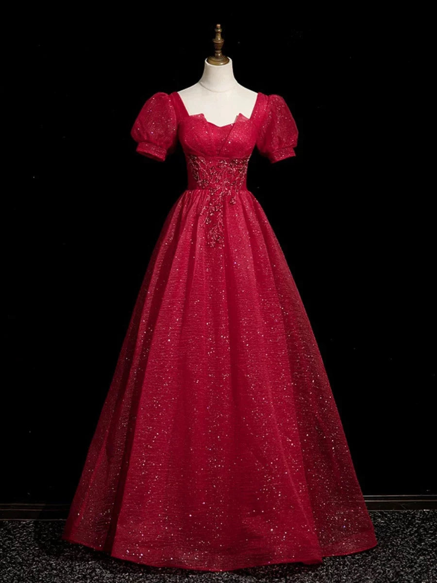 Robe de soirée trapèze bordeaux à manches courtes et perles, en tulle, longue, robe de bal, nv4280