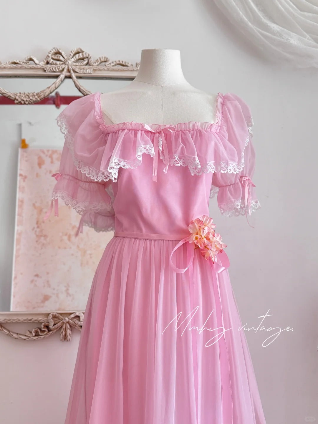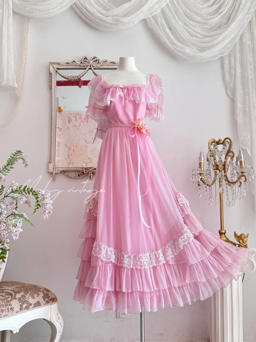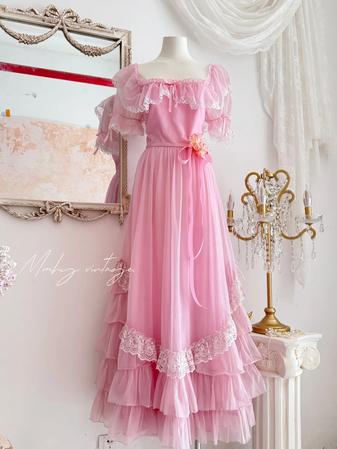Robe de princesse longue en mousseline de soie et tulle, rose, rétro, mignonne, exquise, à la mode, avec nœud en dentelle, manches bouffantes, à volants, robe de soirée, anniversaire, cérémonie, adulte, nv4090