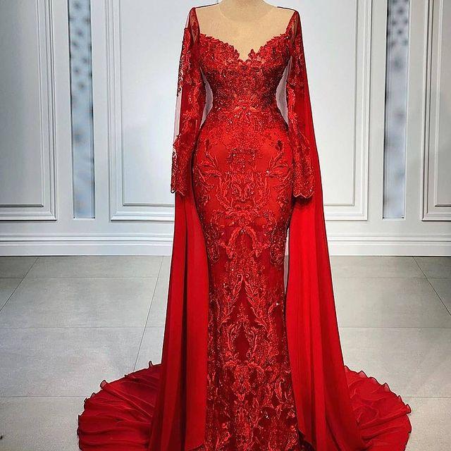 Red Luxurious Mermaid Prom Dresses Sheer Neck Lace Beaded Evening Formal Party Gowns Dress nv4