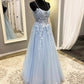 Blue Spaghetti Strap Tulle Long Prom Dress with Lace, A-Line Evening Party Dress nv1430