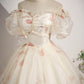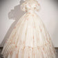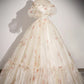 Champagne Floral Tulle Long Prom Dress, Beautiful Short Sleeve A-Line Evening Party Dress nv1614