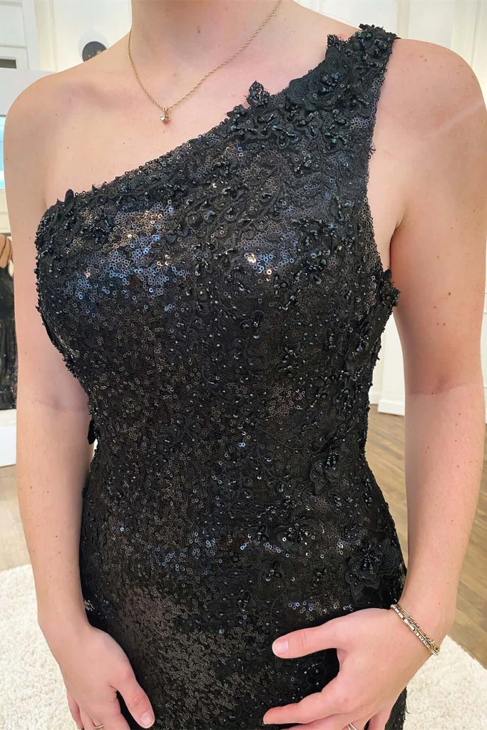 Black Lace Sequins Mermaid Long Prom Dresses With Slit, Evening Gown nv966