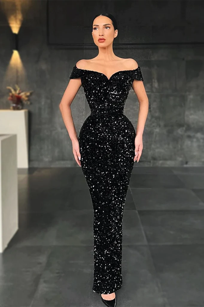 Elegant Black Sparkly Sequin Off Shoulder Mermaid Long Prom Dresses, Floor Length Party Dress,Evening Dress nv325