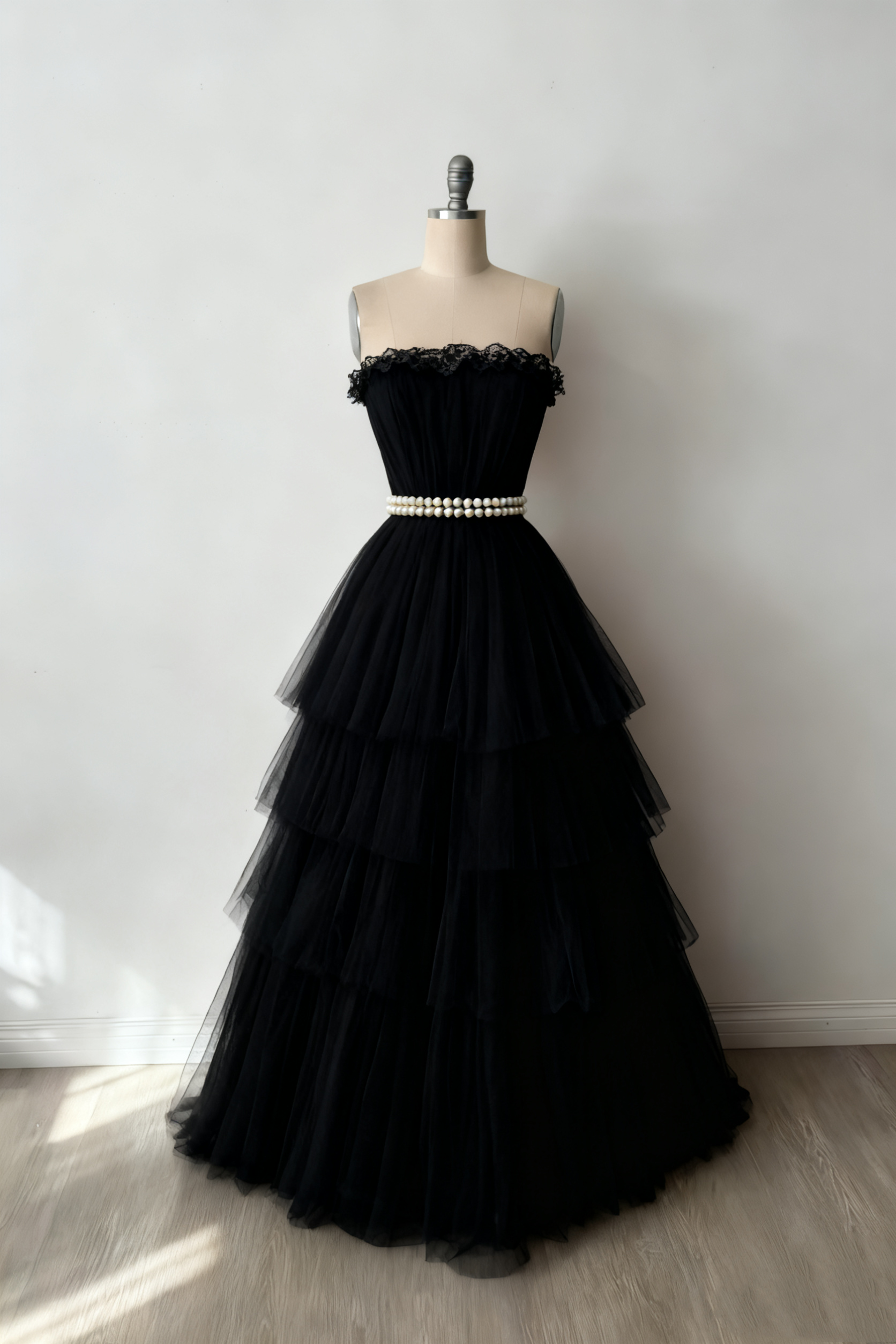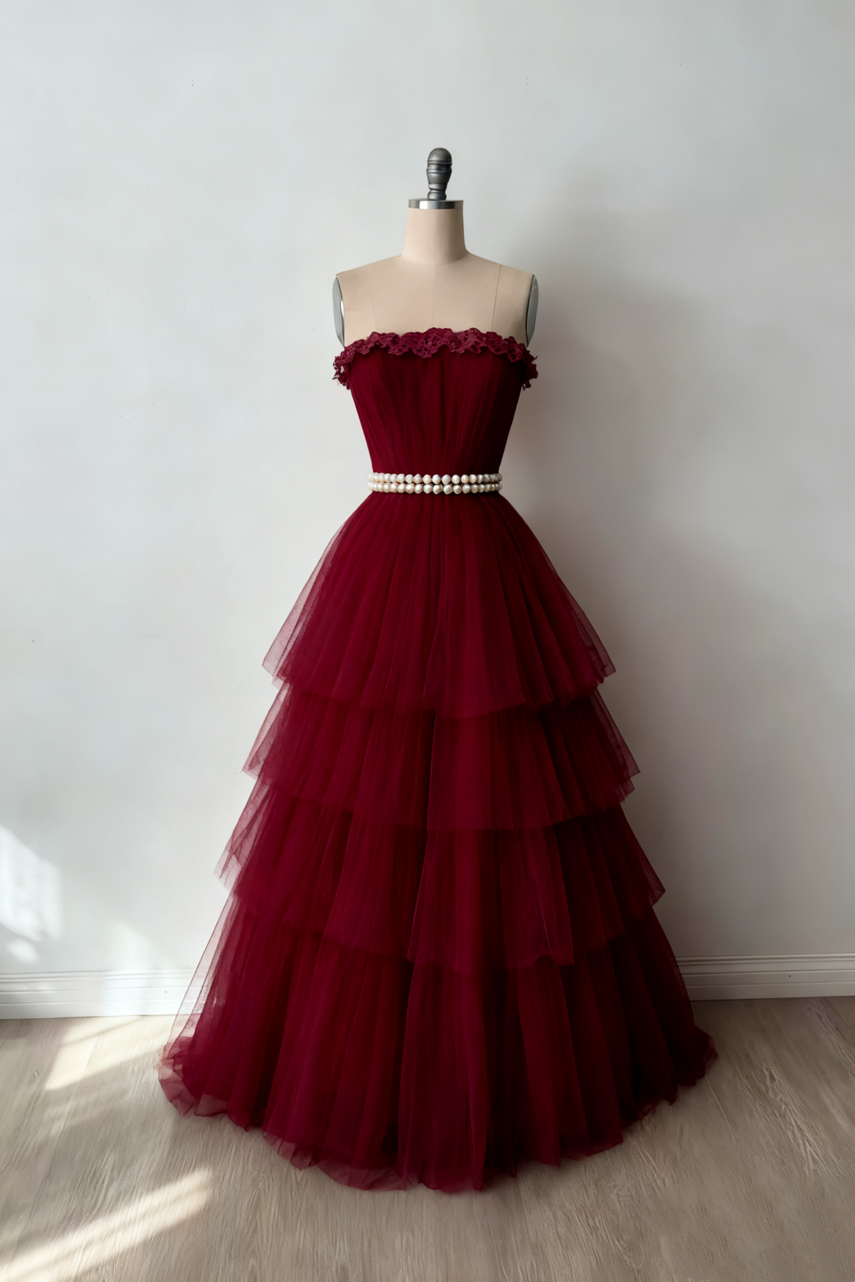 (Exclusive Original Design Dress)Sleeveless Ivory Tulle Gown | Fairy Luxury Lace Pearl Belt Tiered Ball Dress for Gala Gathering NV6305