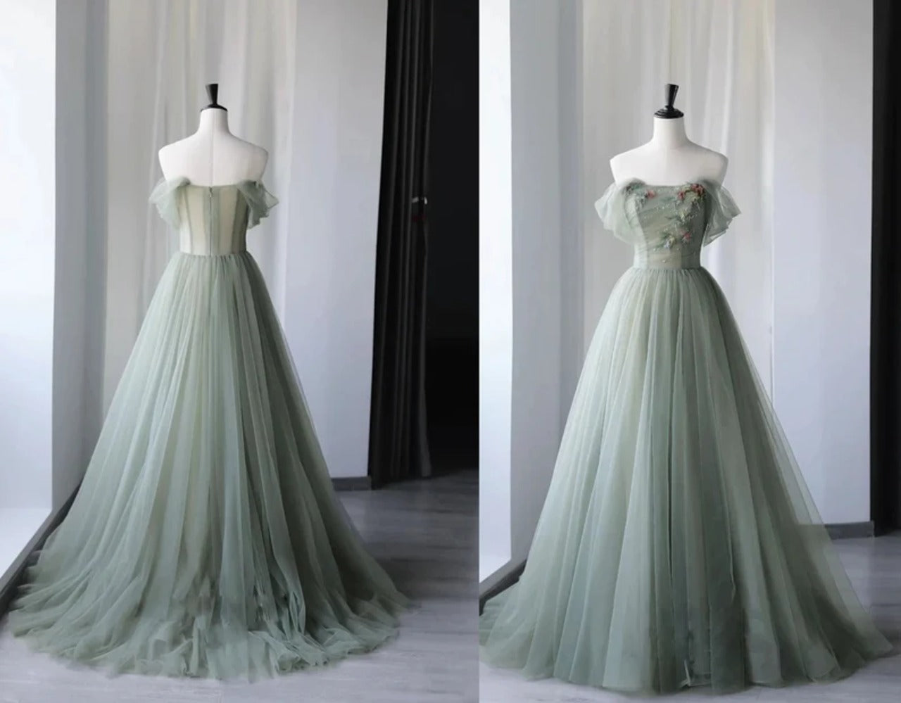 Green elegant A-line off-shoulder long tulle ball gown evening dress graduation dress coming of age ceremony dress nv1413