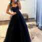 Navy Blue Dotted Tulle A Line Prom Dresses, A-Line Sweetheart Neckline Bow Tie Shoulder Evening Dresses nv1423