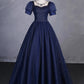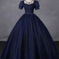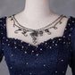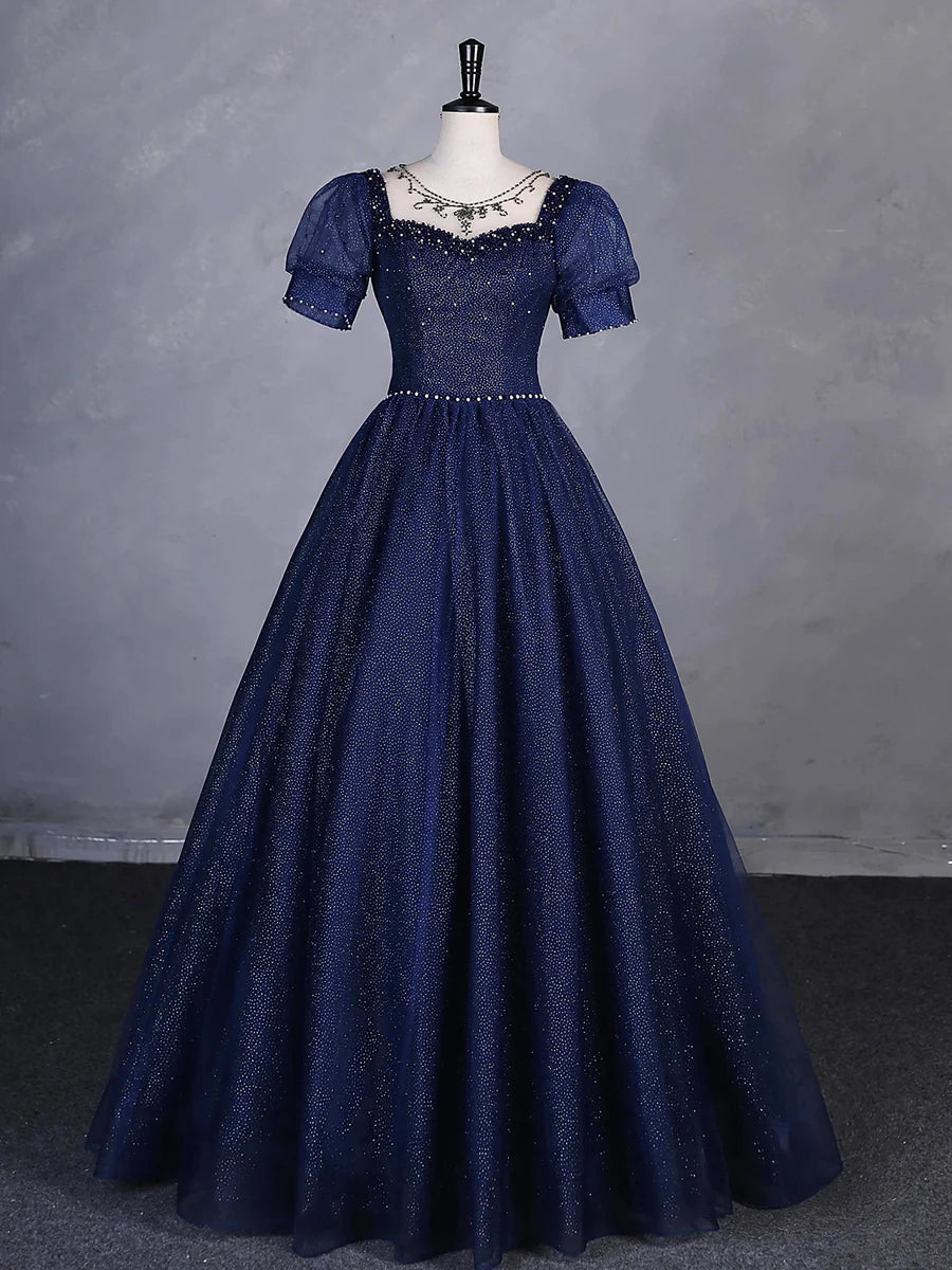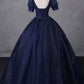 Navy Blue Tulle Beading Long Party Dress, Blue Scoop NecklineShort Sleeve Evening Dress nv1652
