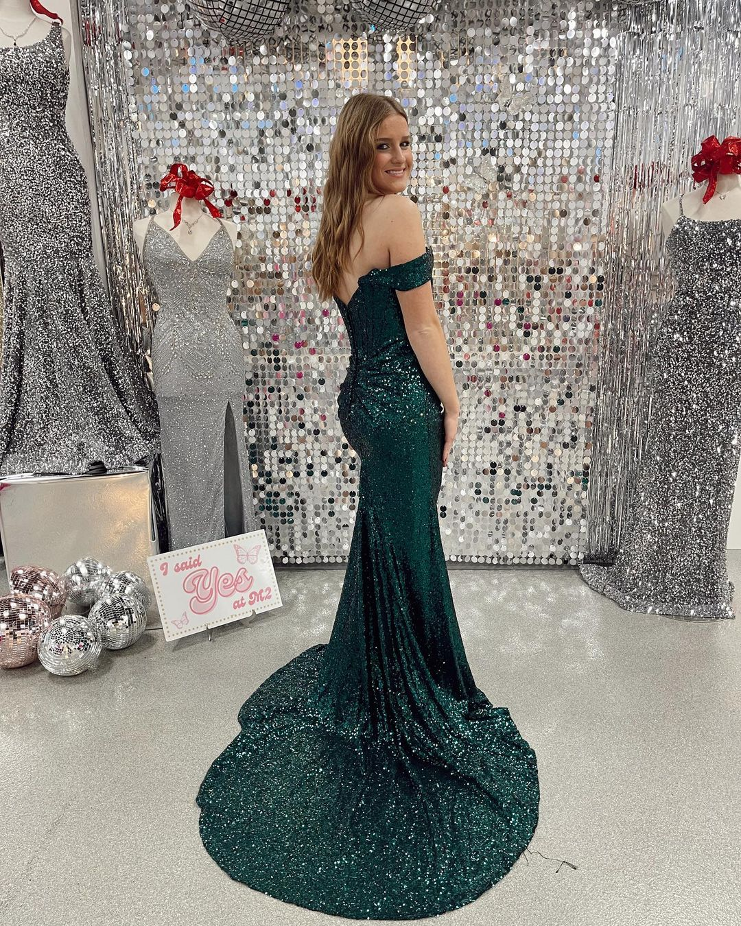 Cute Mermaid Off the Shoulder Dark Green Sequins Prom Dresses with Slit nv823