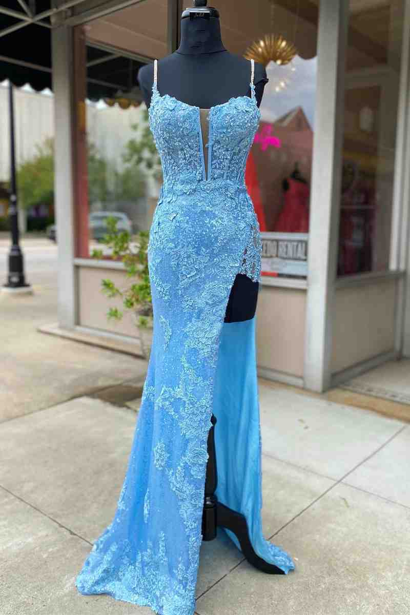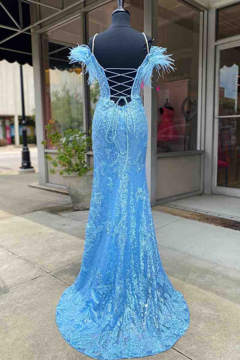 Light Blue Appliques Long Prom Dress with Detachable Feathered Shoulder nv469