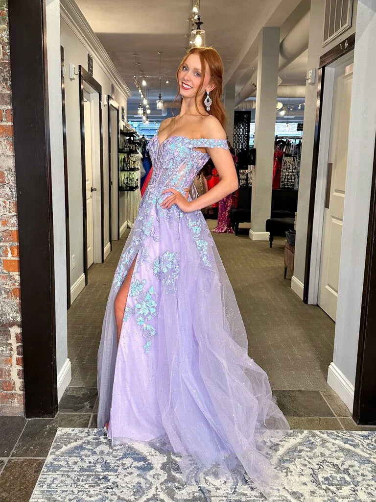 Shiny V Neck Off Shoulder Lilac Lace Long Prom Dresses, Lilac Lace Formal Dresses, Purple Tulle Evening Dresses nv1507