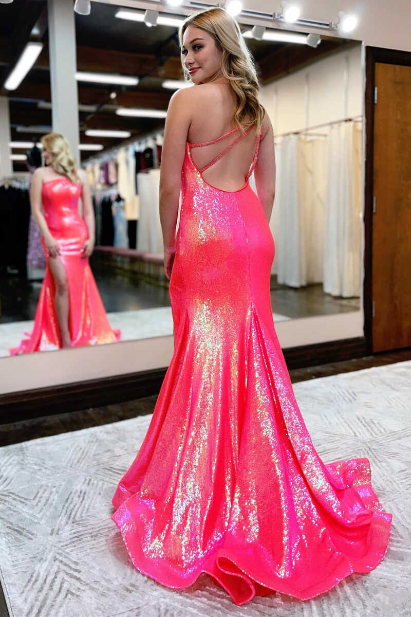 Shiny One-Shoulder Backless Mermaid Long Formal Dress with Slit nv468