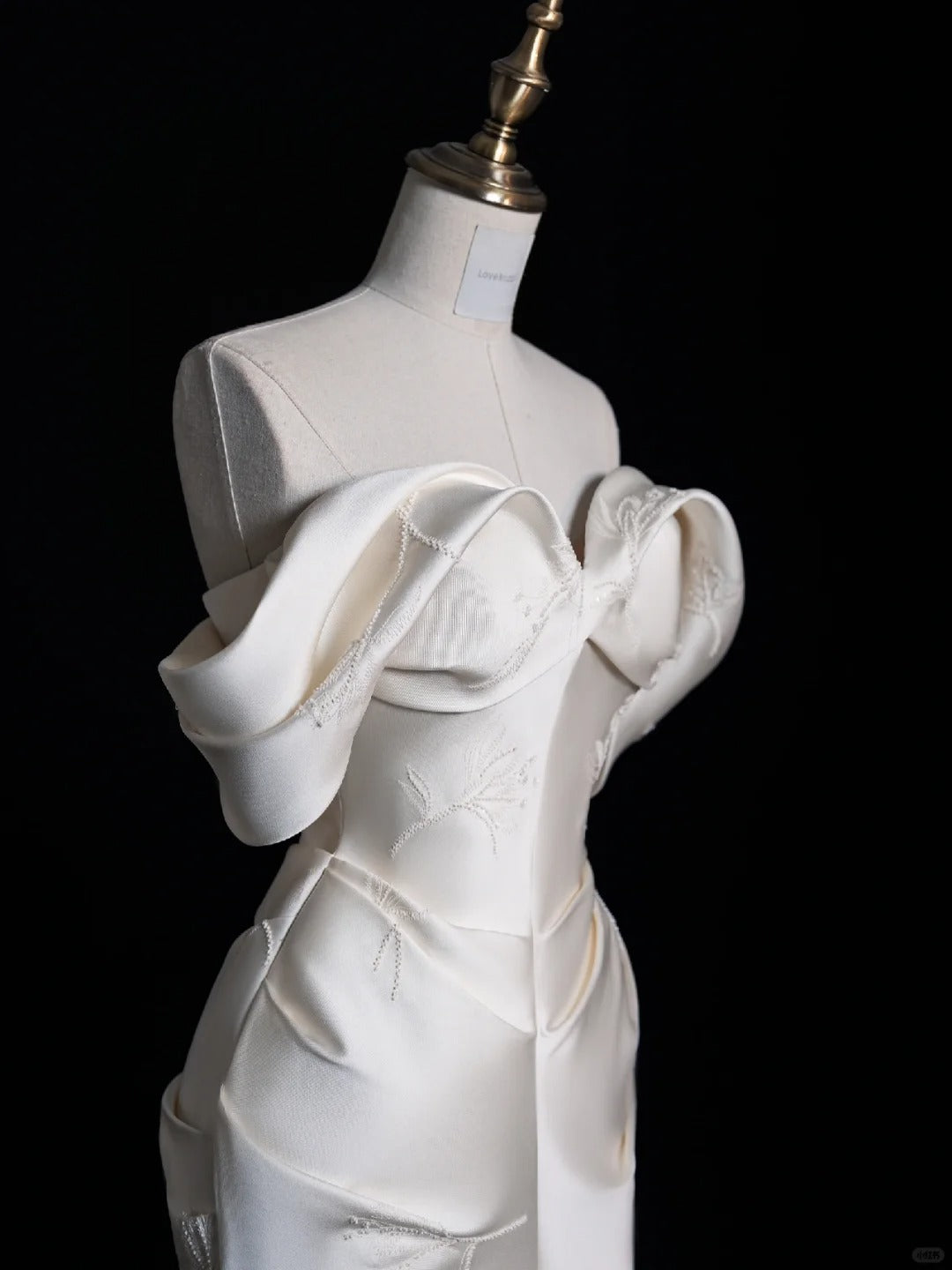 White Gorgeous Exquisite Beaded Long Satin Floor Length Mermaid Slim Ball Gown Evening Gown Wedding Dress nv4124